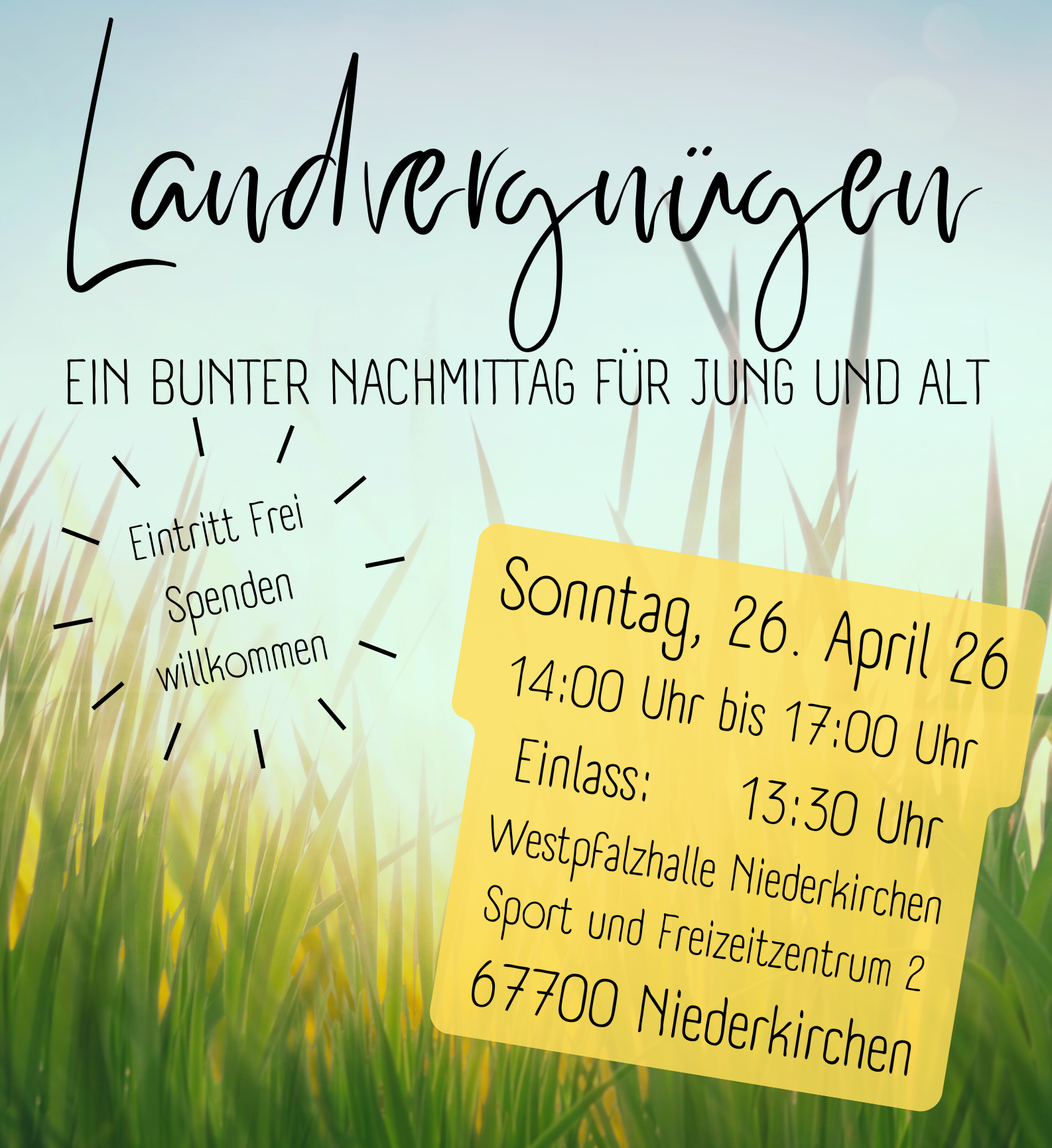 Herzlich willkommen zum bunten Landvergnügen! Am Sonntag, 26. April 2026, ab 14:00 Uhr laden wir alle – jung und alt – zu einem fröhlichen und abwechslungsreichen Nachmittag in die Westpfalzhalle ein. Genießt bei Kaffee...