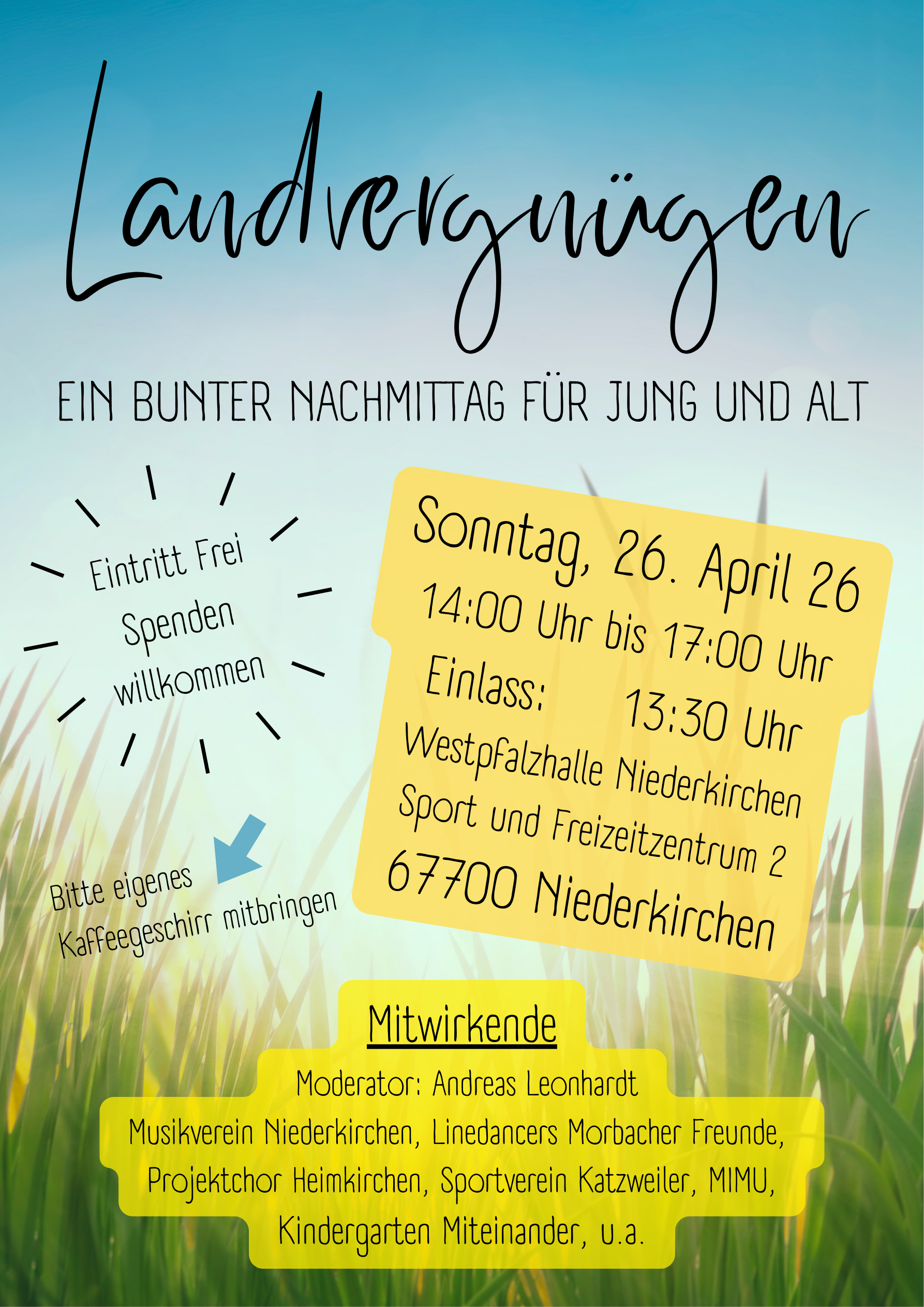 « Alle Veranstaltungen Landvergnügen – Bunter Nachmittag 26. April - 14:00 bis 18:00 Kostenlos « Wanderndes Dorfcafé in Morbach Wildwuchs-Runde im Mai » Zum Kalender hinzufügen Google Kalender iCalendar Outlook 365 Outlook Live Details Datum: 26. April Zeit: 14:00 bis 18:00 Eintritt: Kostenlos Veranstalter Ortsgemeinde Niederkirchen Veranstalter-Website anzeigen Veranstaltungsort Westpfalzhalle Niederkirchen Sport- und Freizeitzentrum 2 Niederkirchen, 67700 Deutschland Google Karte anzeigen