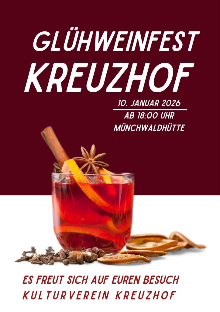 « Alle Veranstaltungen Glühweinfest Kreuzhof 10. Januar, 2026 - 18:00 bis 22:00 « Wanderndes Dorfcafé Wörsbach Wanderndes Dorfcafé in Heimkirchen » Zum Kalender hinzufügen Google Kalender iCalendar Outlook 365 Outlook Live Details Datum: 10. Januar, 2026 Zeit: 18:00 bis 22:00 Veranstalter Kulturverein Kreuzhof Veranstaltungsort Münchwaldhütte Heimkirchen-Kreuzhof, Google Karte anzeigen