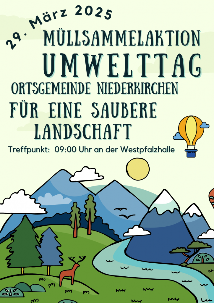 Am Samstag, den 29. März von 09:00 bis 13:00 Uhr führt die Gemeinde zusammen mit den örtlichen Vereinen einen Umwelttag durch. Wir sammeln Müll auf Feld, Flur und Bachufern und bringen ihn zum Container an der Westpfalzhalle. Wer uns unterstützen möchte, melde sich bei den Ortsvorstehern oder komme um 9:00 an die Westpfalzhalle.