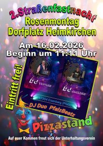 🎊 Am 16. Februar endet die Session mit einem Highlight: Die Straßenfastnacht in Heimkirchen auf dem Dorfplatz – hier wird gemeinsam gefeiert, gelacht und der Fasching gebührend verabschiedet!