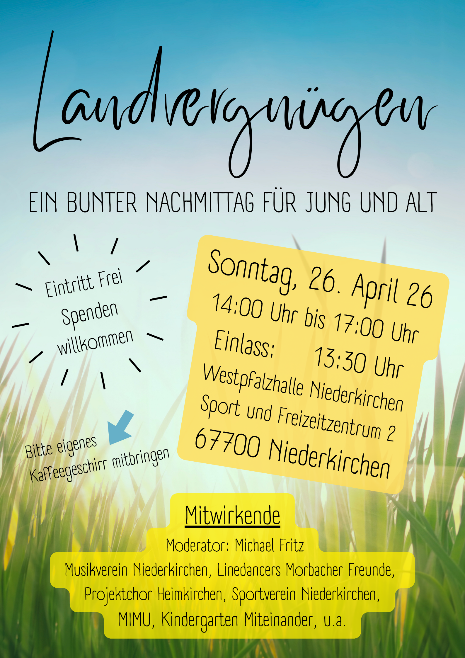 Am Sonntag, 26. April 2026, ab 14:00 Uhr laden wir alle – jung und alt – zu einem fröhlichen und abwechslungsreichen Nachmittag in die Westpfalzhalle ein. Genießt bei Kaffee und leckerem Kuchen ein gemütliches Beisammensein und lasst euch von einem bunten Programm begeistern!